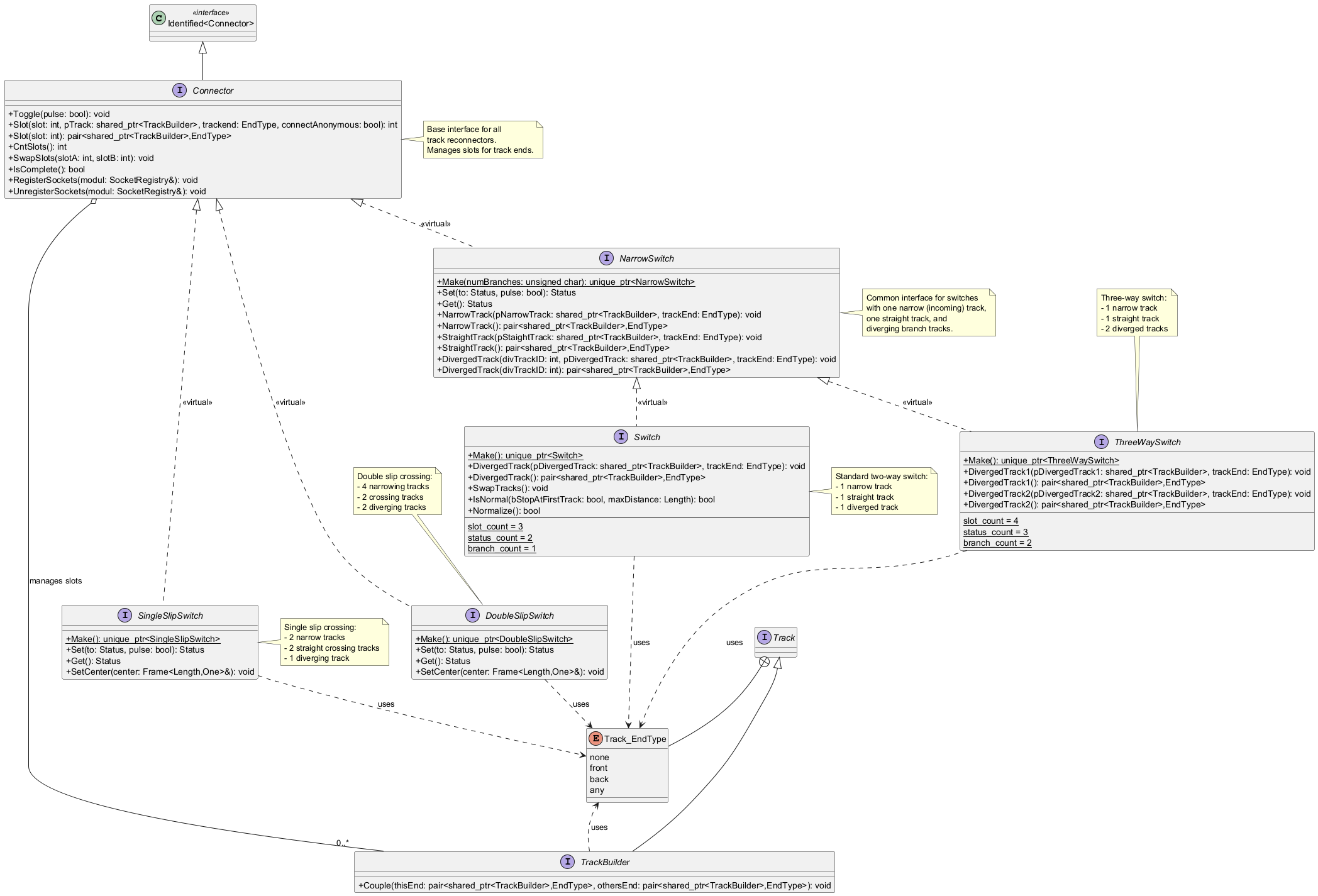 As one can see from the above image, a switch is basically a re-connector of track ends. So we call them 'Connector' in their most general form. A connector provides several slots for being populated with track ends. It then maintains certain states and switching from one state to another means reconnecting the track ends in a specific way. To deal with the many intricacies of specific switches we also provide a (two way) Switch, a ThreeWaySwitch, SingleSlipSwitch, DoubleSlipSwitch and the like. This way, what is called a switch in reality, would be made up e.g. from three tracks and a connector.