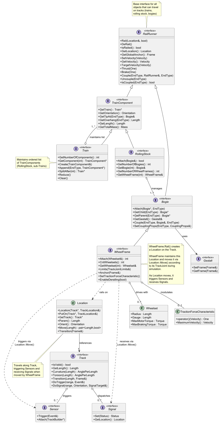A Train is a RailRunner that maintains an ordered list of TrainComponents. RollingStock and Train itself qualify as TrainComponents. That way a train might be composed from other trains.