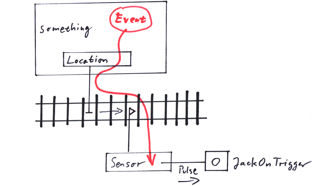 While a Location is moved along the tracks, thereby for example representing a train tip, it is fed by an Event, carrying the necesssary information for a specialized Sensor to figure out whether to trigger. If the Sensor triggers, that means it creates a pulse in an associated Jack.