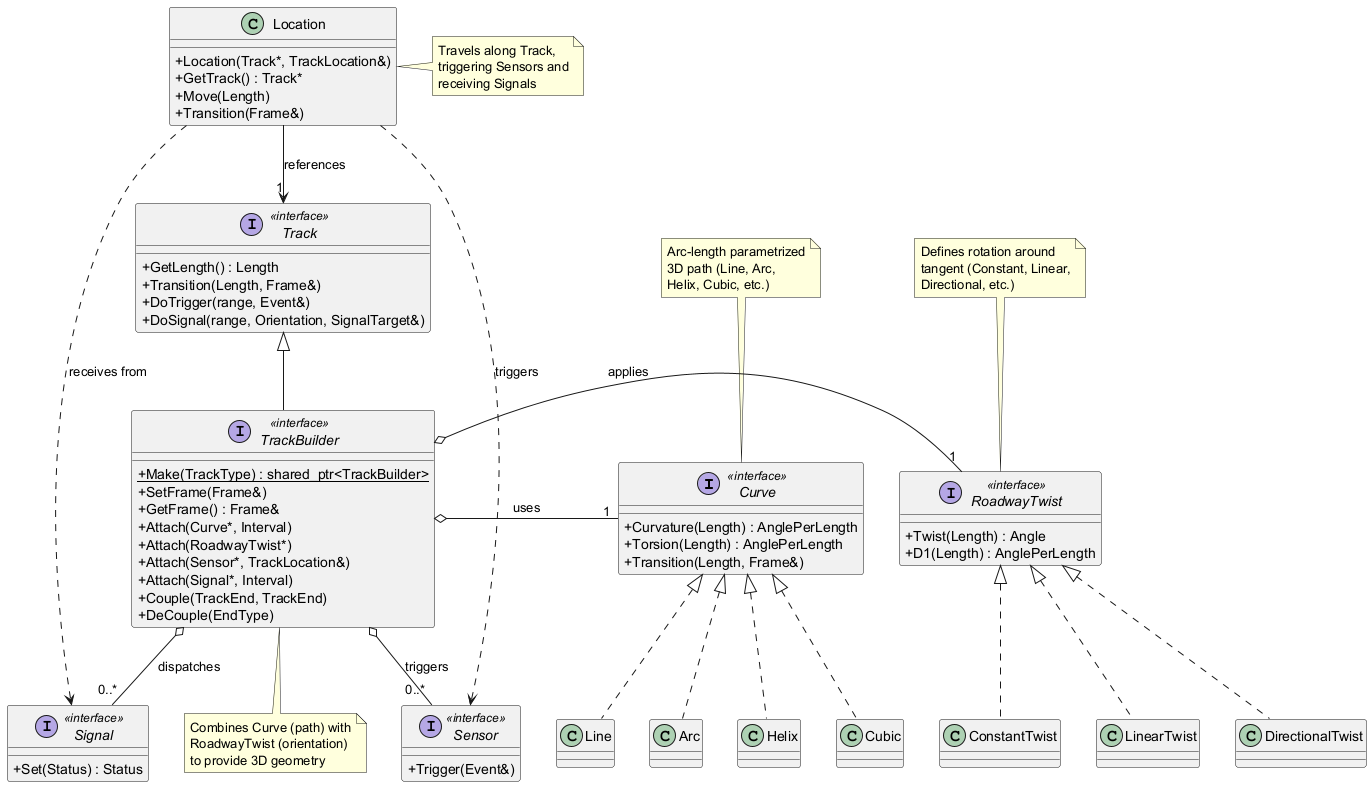 Trax' tracks provide two interfaces: the Track interface for using a track, e.g. transition the track, to get a 3D location for a track parameter value; and the TrackBuilder interface, for creating track geometry by attaching curves and twists.